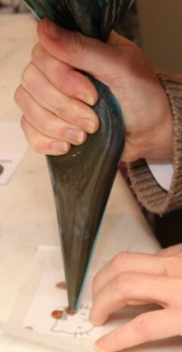 5. Create a little disk or embellishment to cover the joins, or if you’ve gone for a more traditional bow with two loops (as demonstrated in the picture on the left) then use your spare strip of flower paste to loop the two bows together. This is what we did, by the way – we obviously weren’t deemed up to the task of the four-loop bow!